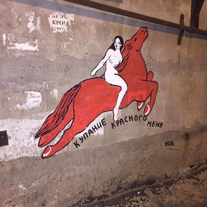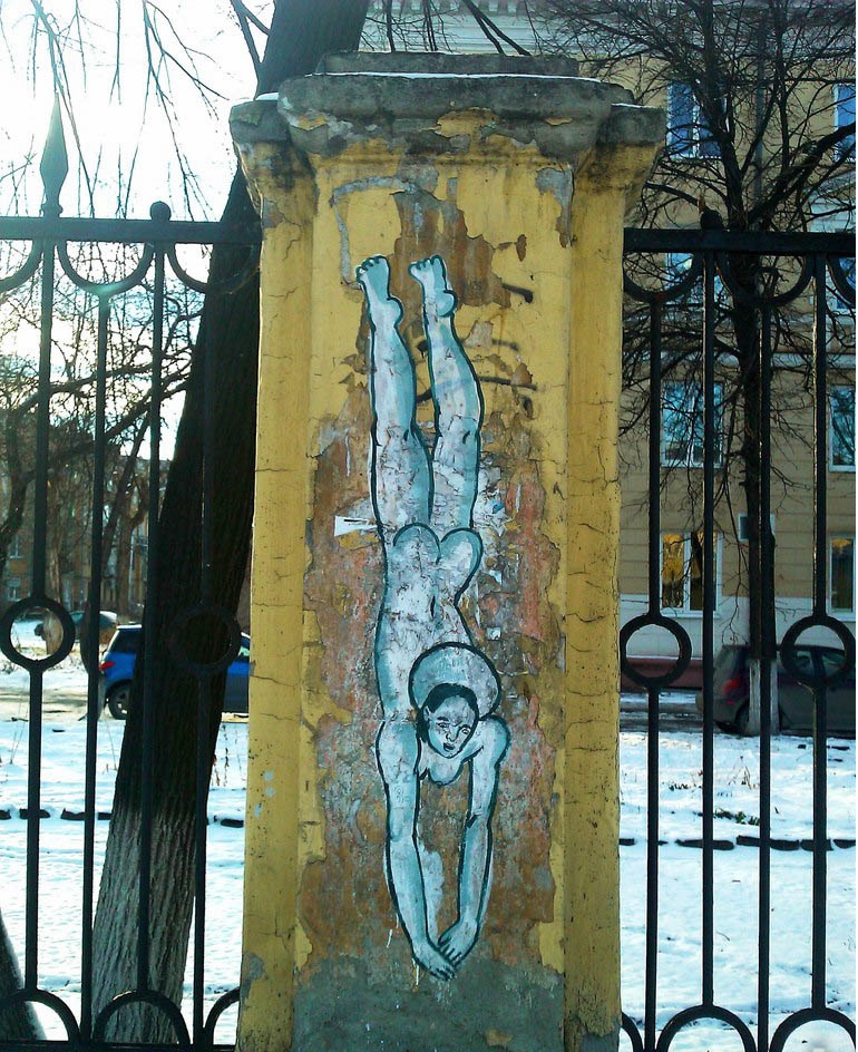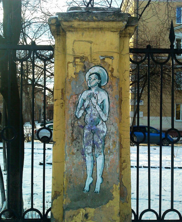 От составителя: Стенная роспись "Семь святых дев худграфа" была выполнена в сентябре 2015 года на заборе Художественно-графического Факультета НТГСПА, через неделю закрашена самой художницей по требованию администрации вуза. В каталог включены фотографии двух фигур.
